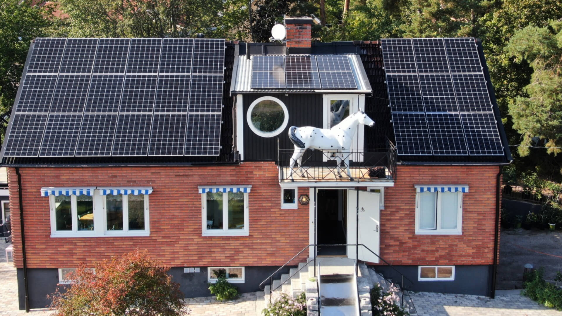På avstånd syns inga skavanker. Höstsolen blänker svagt i solcellerna, som täcker större delen av villataket. Men under panelerna kan det vara rörigt.